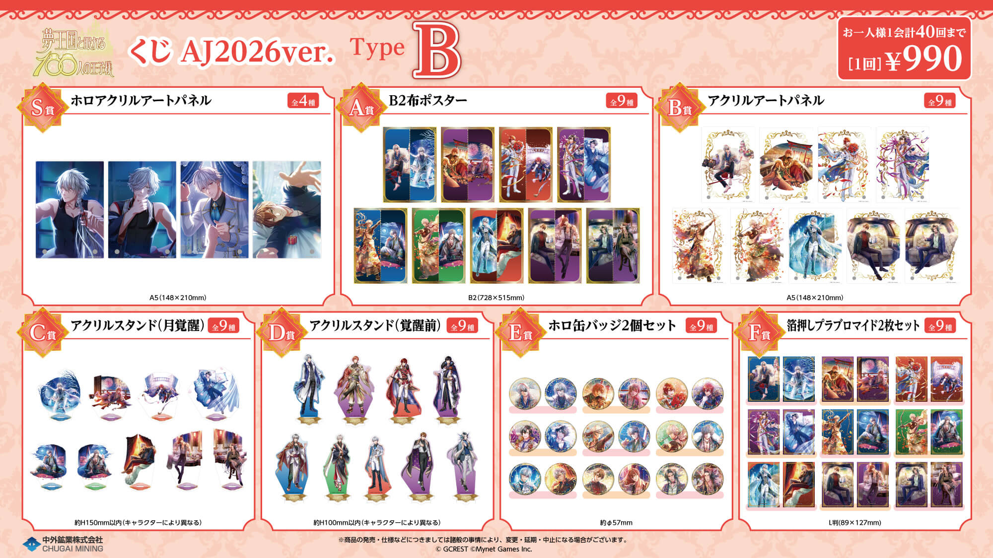 中外鉱業ブースにて「夢王国と眠れる100人の王子様 くじ AJ2026ver.」を1会計くじ3回分ご購入毎に、特典パールポストカード(全13種)をランダムで1枚プレゼントします。