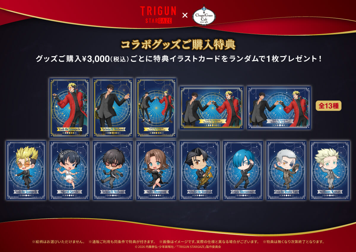 キャラクターグッズの商品企画・製作・販売を行う中外鉱業株式会社コンテンツ部は、『TRIGUN STARGAZE』× Chugai Grace Cafe コラボカフェを東京・大阪の2店舗で開催します。