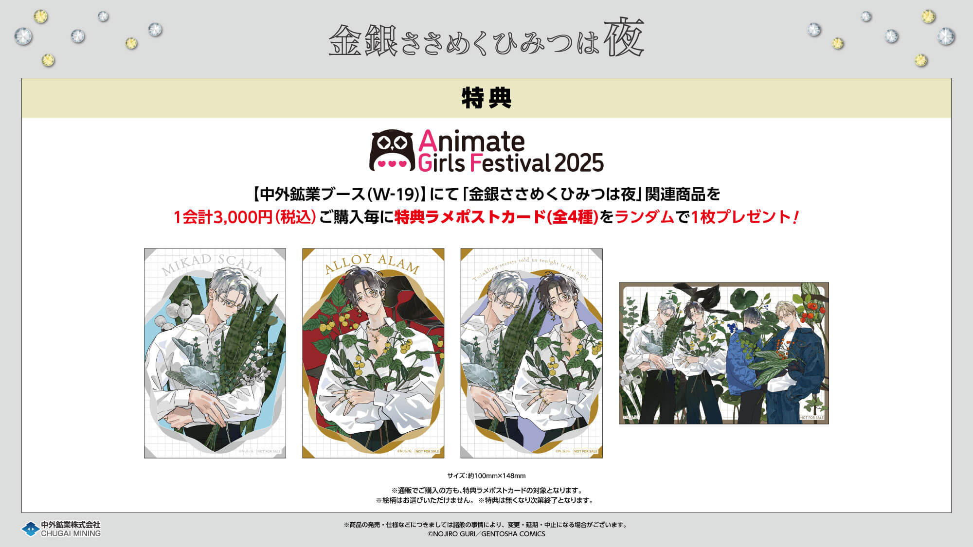 中外鉱業ブースにて『金銀ささめくひみつは夜』AGF関連商品を1会計3,000円(税込)ご購入毎に、特典ラメポストカード(全4種)をランダムで1枚お渡しいたします!